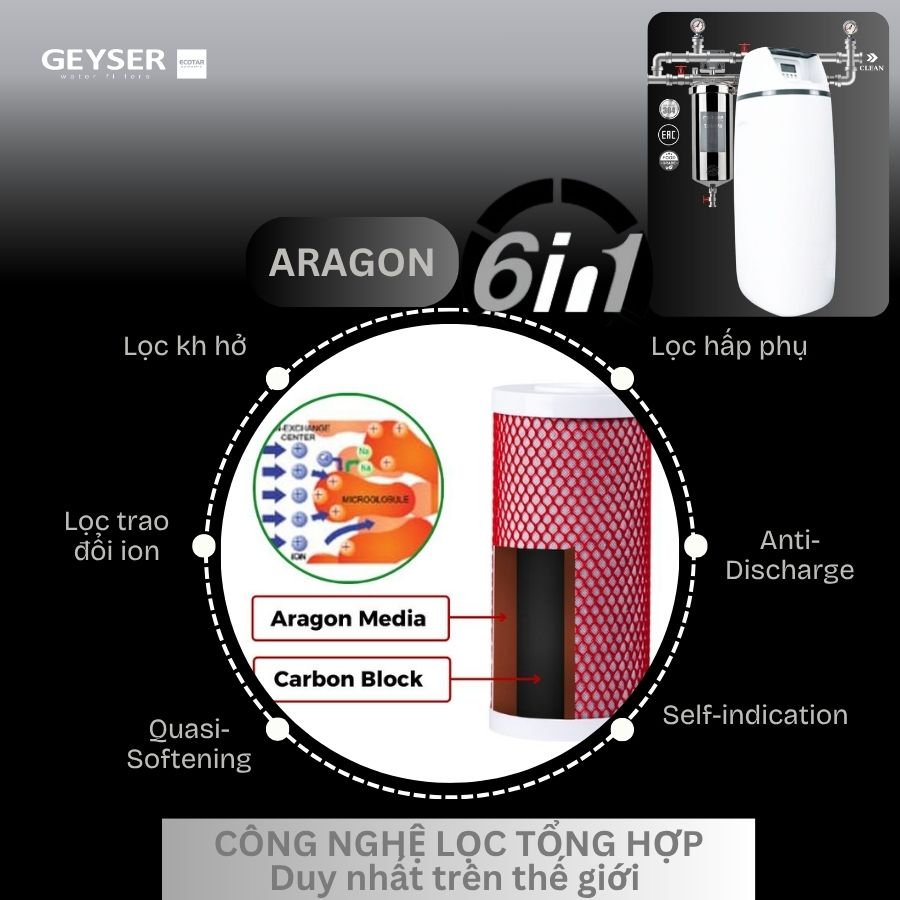 Aragon là công nghệ lọc nổi tiếng gần 40 năm qua của Geyser – Được coi là trái tim của trong hầu hết các bộ lọc nước của Geyser, đã được cấp bằng phát minh sáng chế, tích hợp 6 cơ chế: